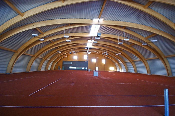 Arenas esportivas construídas com elementos estruturais em madeira MLC indiscutivelmente são mais bonitas. Quadras de tênis, riding arenas (picadeiro para adestramento de eqüinos e equitação), pistas de patinação e ginásios esportivos em geral podem ser construídas utilizando madeira MLC, justamente porque esse material possibilita construções com grandes vãos livres.